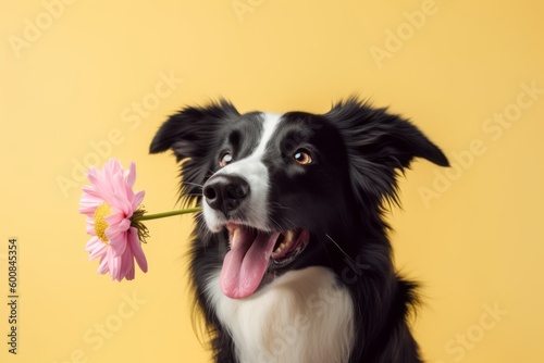 Fototapeta premium Full-length portrait photography of a happy border collie having a flower in its mouth against a pastel or soft colors background. With generative AI technology