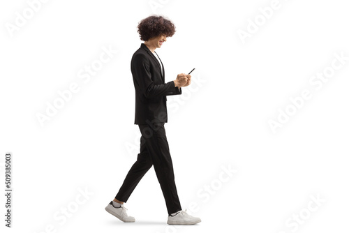 Obraz premium Full length profile shot of a young tall man walking and using a smrtphone