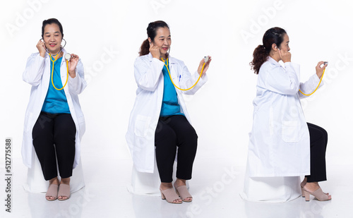 Naklejka premium Full length 40s 50s Asian Senior Woman medical healthcare Doctor, sitting...