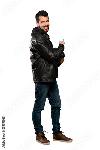 Naklejka premium Full-length shot of Biker man pointing back over isolated white background