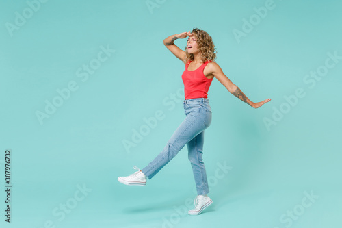 © ViDi Studio, Obraz premium Full length side view of shocked young blonde woman 20s wearing pink tank top jeans standing holding hand at forehead looking far away distance isolated on blue turquoise background, studio portrait.