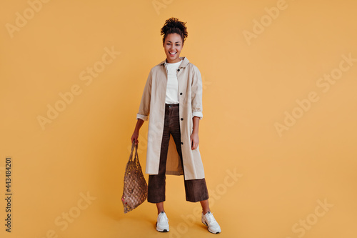Fototapeta premium Full length view of confident african american woman with string bag. Studio shot of black girl wearing beige trench coat.
