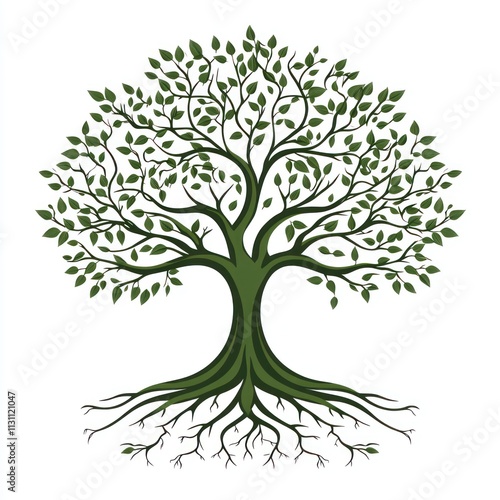 Fototapeta premium Full lush green tree with extensive roots against a plain white background.