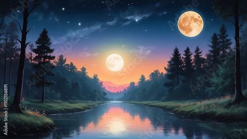 © Faxriddin, Fototapeta premium full moon and night landscape