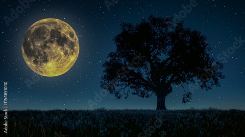 Fototapeta premium Full Moon and Tree Silhouette Under a Starry Night Sky..