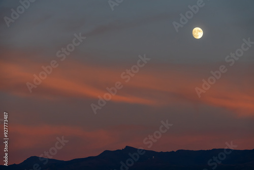 © Miguel Ángel RM, Obraz premium Full moon between orange clouds at dusk