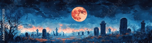 Fototapeta premium Full moon, casting shadows, gothic gravestones, Watercolor style