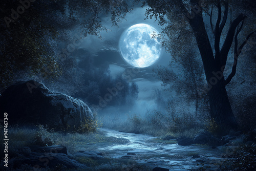 © Sekai, Fototapeta premium Full Moon Casts a Silvery Glow Over the Forest: Nighttime Serenity