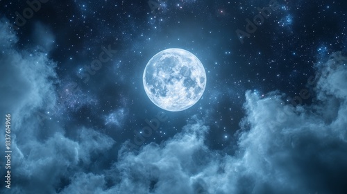© Chaikit, Fototapeta premium Full moon emerging from behind ethereal cloud veil, star field with varying brightness, cirrus cloud wisps, deep space background, atmospheric light diffusion