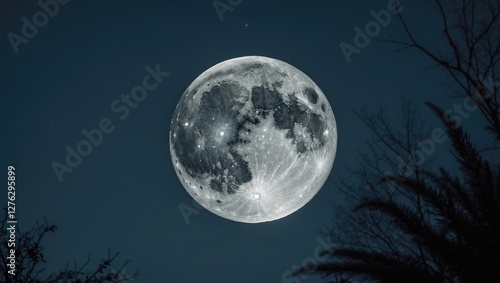 Naklejka premium Full moon illuminated in a night sky with silhouetted tree branches in the foreground and stars visible in the background.