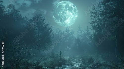 Naklejka premium Full moon illuminating a dense forest, creating eerie shadows