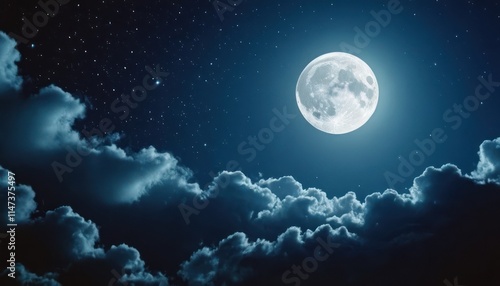 © Nibir, Fototapeta premium Full moon illuminating clouds and stars in bluish night sky