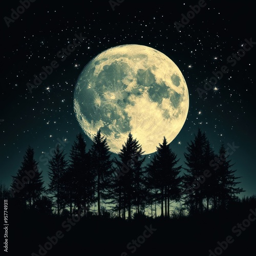 Fototapeta premium Full Moon Illuminating Silhouetted Pine Trees in a Starry Night