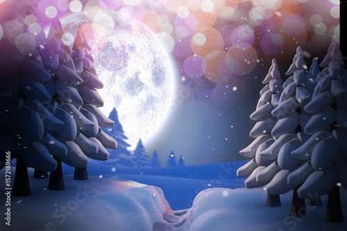 Naklejka premium Full moon is glowing over nighttime flat design with snowy path, evergreens, falling snow and bokeh