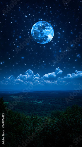 Naklejka premium Full moon over a dark landscape at night with stars and clouds.