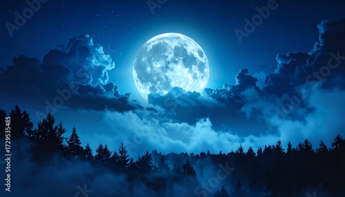 Obraz premium Full moon over a misty forest at night