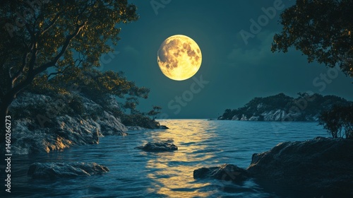 Naklejka premium Full moon over a tranquil coastal scene at night.
