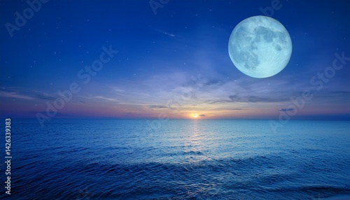 © l1gend, Fototapeta premium Full Moon Over Calm Ocean at Sunset