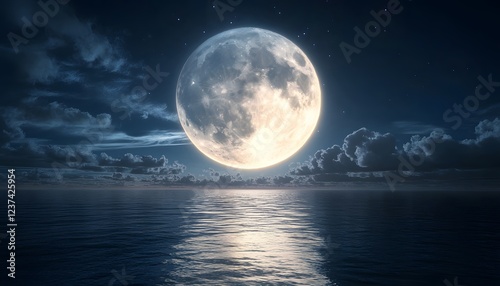 © Berkah, Fototapeta premium Full Moon Over Calm Ocean Night Sky Clouds Stars