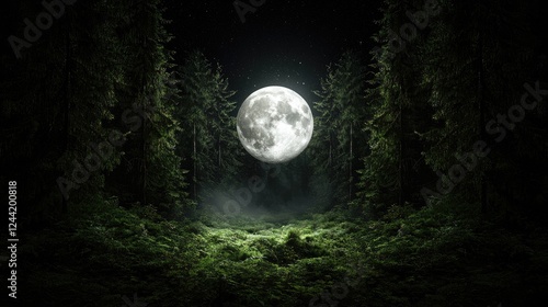 © BROPRADANA, Naklejka premium Full moon over forest, mystical night scene, nature background, fantasy art