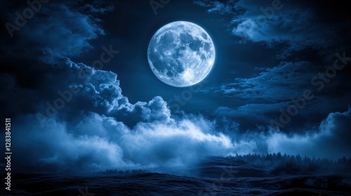 Fototapeta premium Full moon over misty forest at night, background clouds, fantasy art