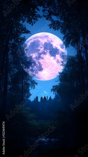 Naklejka premium Full Moon over Silhouetted Forest and Castle