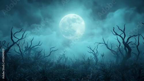 Fototapeta premium Full Moon Over Spooky Forest with Dead Trees and Fog