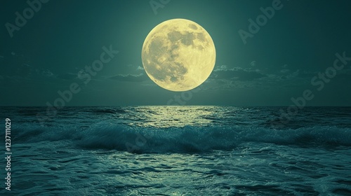 Fototapeta premium Full moon over tranquil ocean waves at night.
