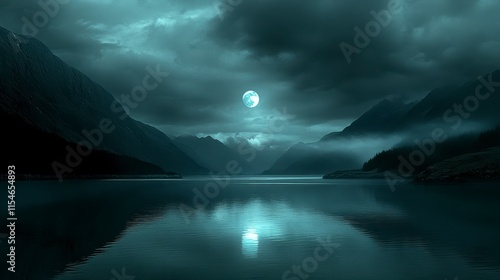 Naklejka premium Full moon reflecting on a serene, misty lake surrounded by dark mountains at...