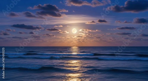 © andi, Obraz premium Full moon rises over a tranquil ocean at sunset