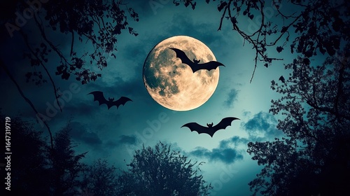© Suphawan, Naklejka premium Full moon shining brightly in a dark Halloween night sky, silhouettes of bats flying across, casting a spooky and magical atmosphere