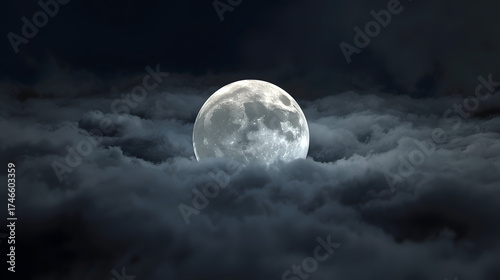 © Ganda, Fototapeta premium Full moon shining brightly through a thick layer of dark, swirling clouds in the night sky.