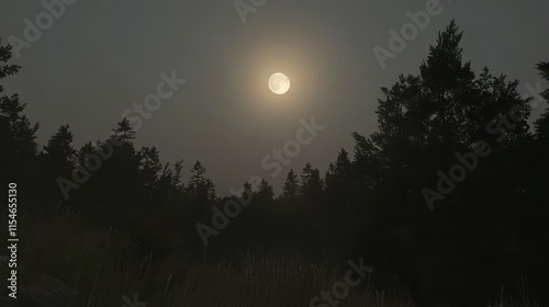 © Hafidz, Fototapeta premium Full moon shining over dark silhouetted forest at night.