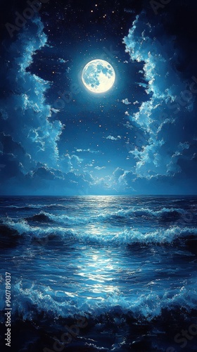 © Ashalina, Fototapeta premium Full moon shining over the ocean at night with clouds and stars.