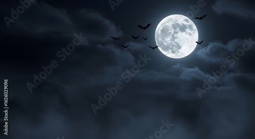 Naklejka premium Full moon shrouded in clouds, bats silhouetted against its bright light, nighttime scene.