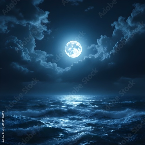 Obraz premium Full moon, stormy ocean at night, dramatic clouds, moonlit waves