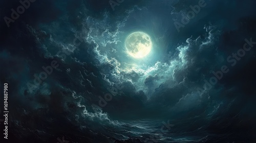 © Dmytro, Fototapeta premium Full moon surrounded by thick dark clouds at night, opening in clouds reveals illuminated lunar surface with visible texture and contrast, creating a moody atmospheric scene. Generative by AI