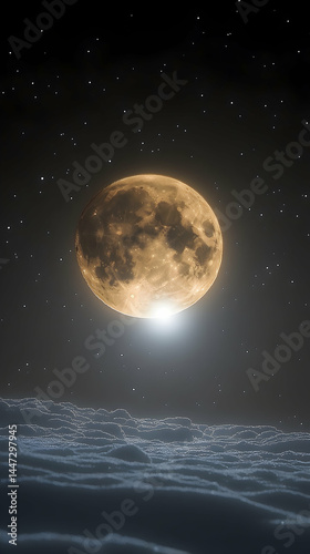 Fototapeta premium Full, orange moon over a dark, starry night sky with clouds