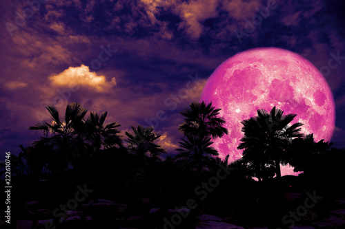 Fototapeta premium full pink moon back silhouette palm tree in dark night heap cloud