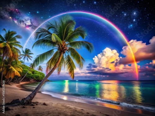 Naklejka premium Full Rainbow Over the Caribbean at Night, Vibrant Colors, Tropical Seascape,...