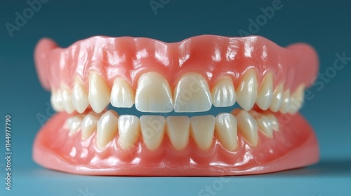 © Zaenal, Obraz premium Full set of artificial dentures on blue background.