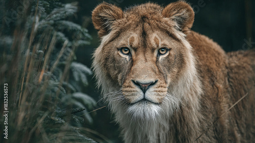 Fototapeta premium Full shot of a wild lion staring at the camera, symbolizing strength,...