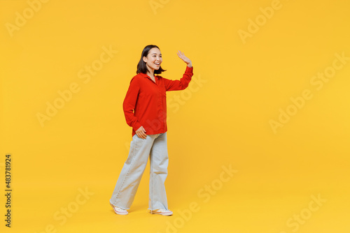 © ViDi Studio, Fototapeta premium Full size body length cheerful young woman of Asian ethnicity 20s in casual clothes look camera go move meet greet waving hand as notices someone isolated on plain yellow background studio portrait.