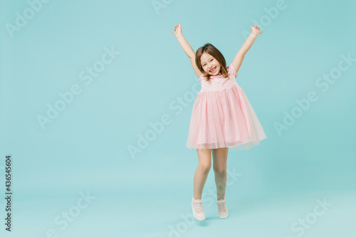 © ViDi Studio, Naklejka premium Full size body length little fun cute kid girl 5-6 years old wears pink dress dancing isolated on pastel blue color background child studio portrait. Mother's Day love family people lifestyle concept.