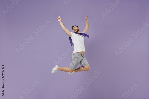Fototapeta premium Full size body length young brunet man 20s wear white t-shirt purple shirt jump celebrate clench fists say yes isolated on pastel violet background studio portrait. People emotions lifestyle concept.