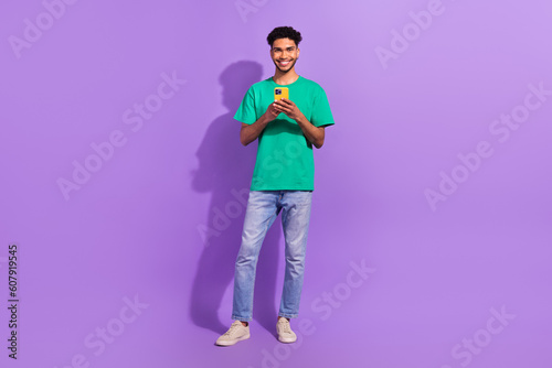 © deagreez, Fototapeta premium Full size cadre of young smiling blogger guy wear green t-shirt denim jeans hold phone browsing twitter isolated on purple color background
