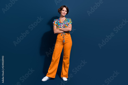 © deagreez, Fototapeta premium Full size photo of attractive young woman crossed hands confident pose dressed flared pants clothes isolated on dark blue color background