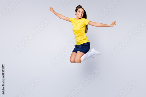 © deagreez, Fototapeta premium Full size photo of cheerful professional soccer player girl jump enjoy play football world championship cup wear kit white socks shoes boots isolated over grey color background