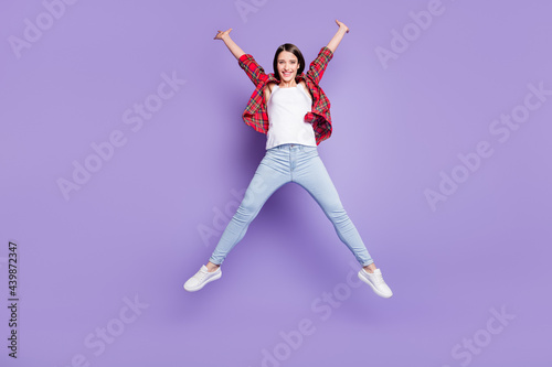 © deagreez, Fototapeta premium Full size photo of cool brunette hairdo young lady jump wear red shirt jeans isolated on purple color background