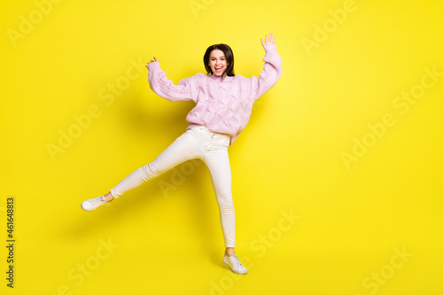 © deagreez, Fototapeta premium Full size photo of funny millennial lady dance wear sweater pants isolated on yellow color background